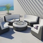 Por ultimo tenemos un sofá circular (presentado en set) junto a una mesa de café. Estos componentes coordinan con su larga isla a la perfección. Ahora que lo pienso esta tumbona isla nos hace recordar a una isla desierta para dos.